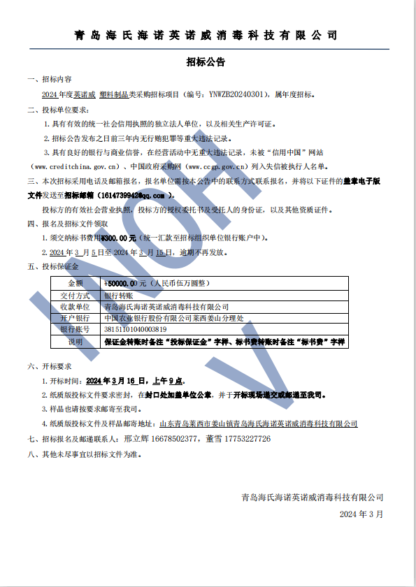 (2024)年度英諾威公司(塑料制品)類采購(gòu)招標(biāo)公告