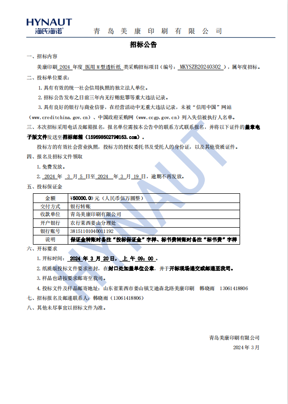 2024年度美康印刷透析紙采購招標項目招標公告